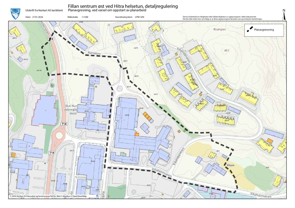 I henhold til plan- og bygningsloven § 12-8 varsles at det er satt i gang planarbeid for Hitra Helsetun gnr./bnr.: 92/16, 92/36, 92/74 og deler av eiendom 90/12, 90/36, 92/1, 92/37, 92/44, 93/135 og 142/22 ved Fillan sentrum i Hitra kommune.