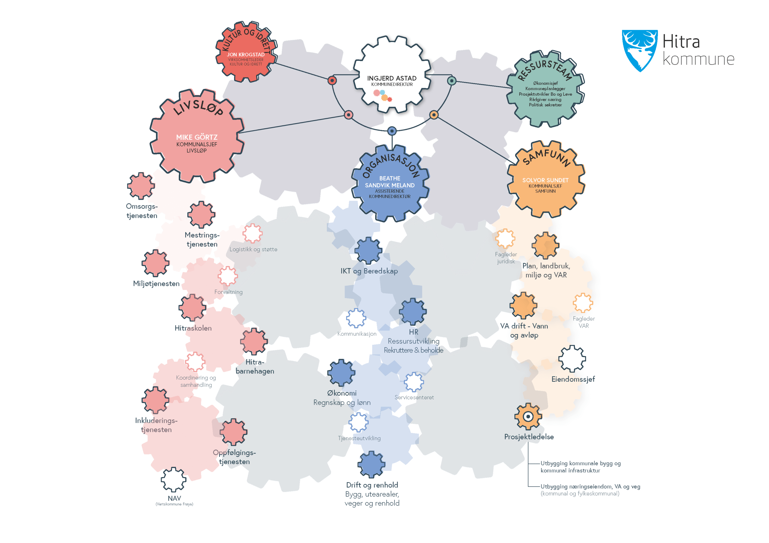 Kommunedirektøren er øverste administrative leder for den kommunale organisasjonen, har det overordnede administrative ansvaret for leveransen av våre tjenester og er bindeleddet mellom det politiske styringsnivået og tjenesteutøvelsen. Ingjerd Astad er kommunedirektør i Hitra kommune. Hun tiltrådte i stillingen i mars 2020. Hun skal sørge for at Hitra kommune utvikles og driftes i henhold til en hver tid gjeldende lov- og regelverk samt til de politiske vedtak som fattes av kommunestyre, formannskap og øvrige utvalg.